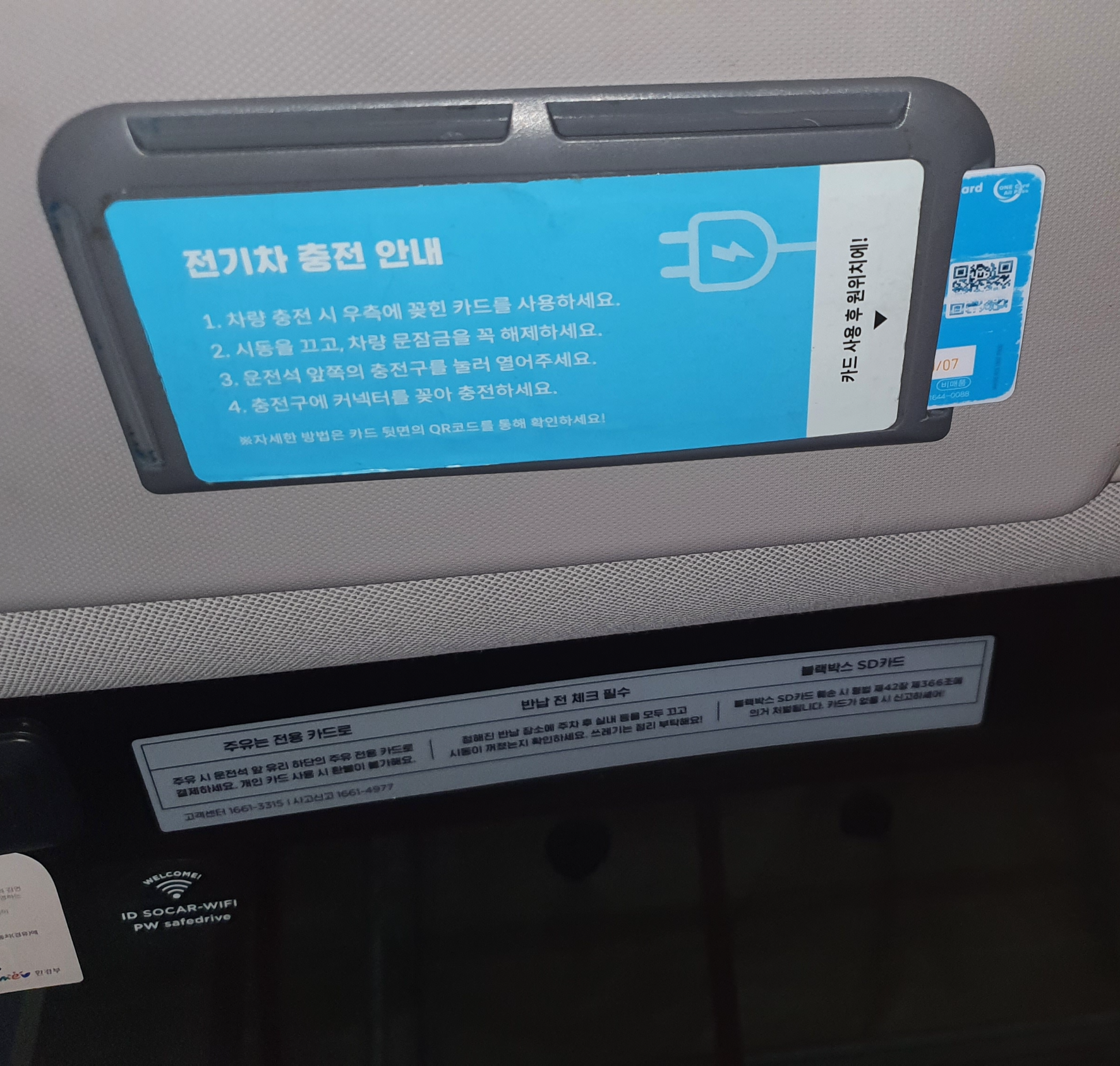 만약 선바이저에 충전 카드가 없다면, 쏘카에 전화해서 신고하면 됩니다.