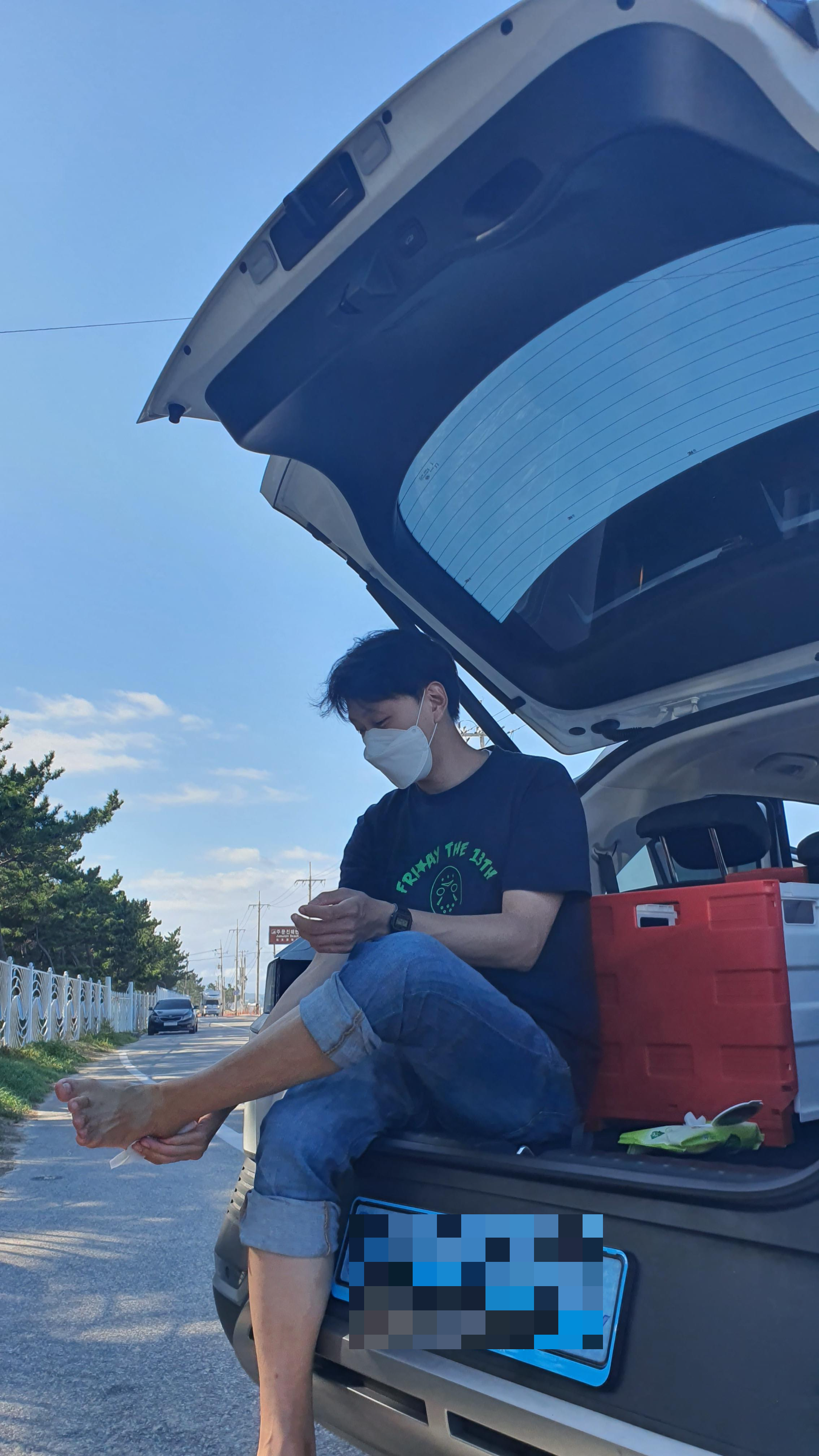 사진은 발에 묻은 해변모래 물티슈로 닦는 거예요.