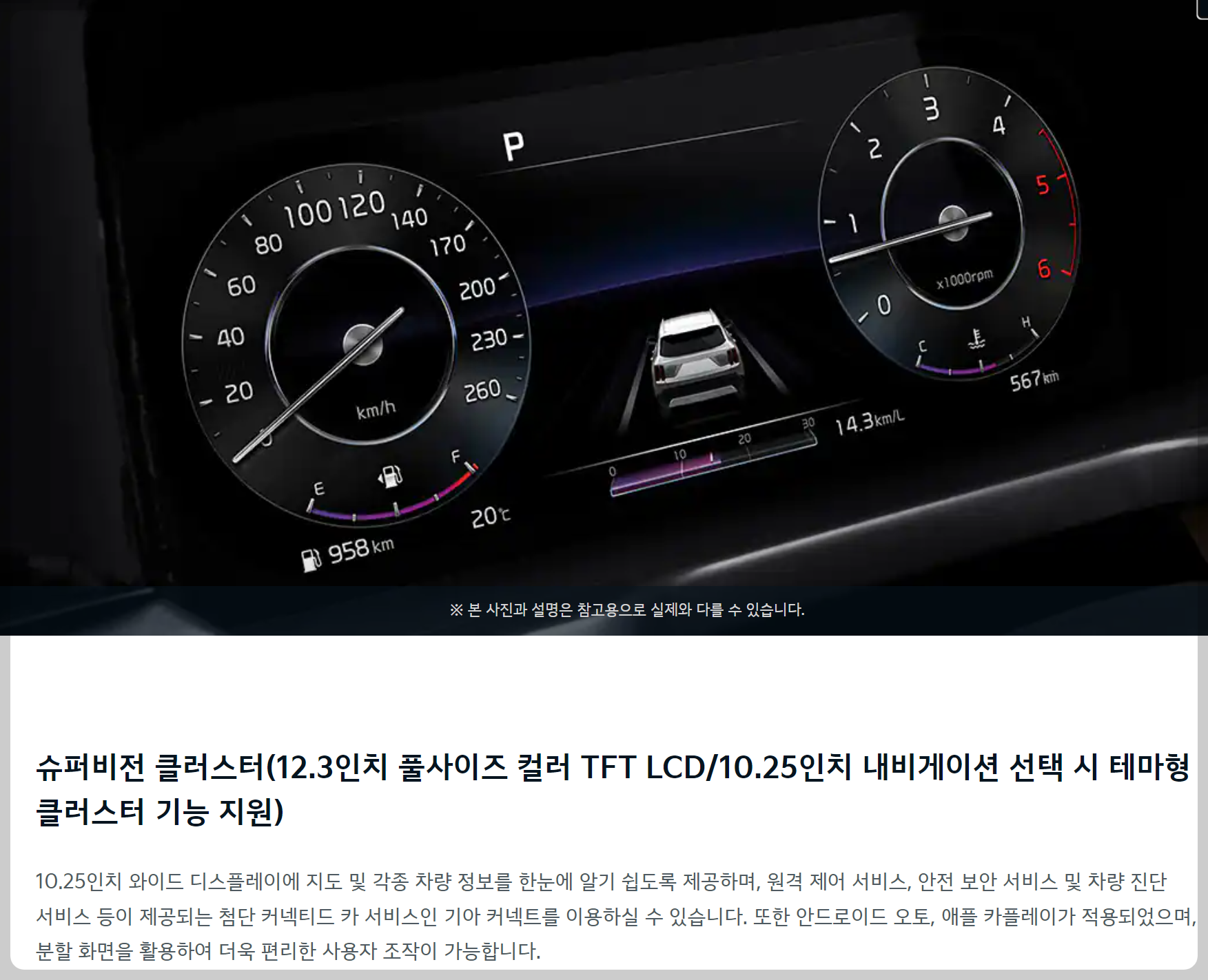 이에 대한 대안으로는 슈퍼비전 클러스터(12.3인치 풀사이즈 칼라 TFT LCD)가 있어요. 선택 사항(옵션)입니다.