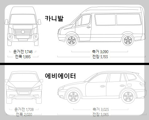 전폭은 에비에이터가 더 넓고, 총 길이(전장)는 카니발이 더 기네요.