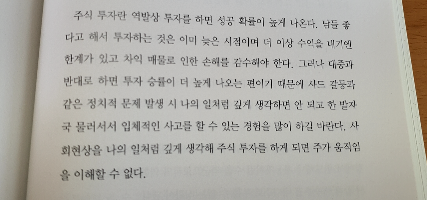 남들 좋다고 해서 투자하는 것은 이미 늦은 시점이며 더 이상 수익을 내기엔 한계가 있고 차익 매물로 인한 손해를 감수해야 한다. 그러나 대중과 반대로 하면 투자 승률이 더 높게 나오는 편이기 때문에 사드 갈등과 같은 정치적 문제 발생 시 나의 일처럼 깊게 생각하면 안 되고 한 발자 국 물러서서 입체적인 사고를 할 수 있는 경험을 많이 하길 바란다. 사회현상을 나의 일처럼 깊게 생각해 주식 투자를 하게 되면 주가 움직임을 이해할 수 없다.