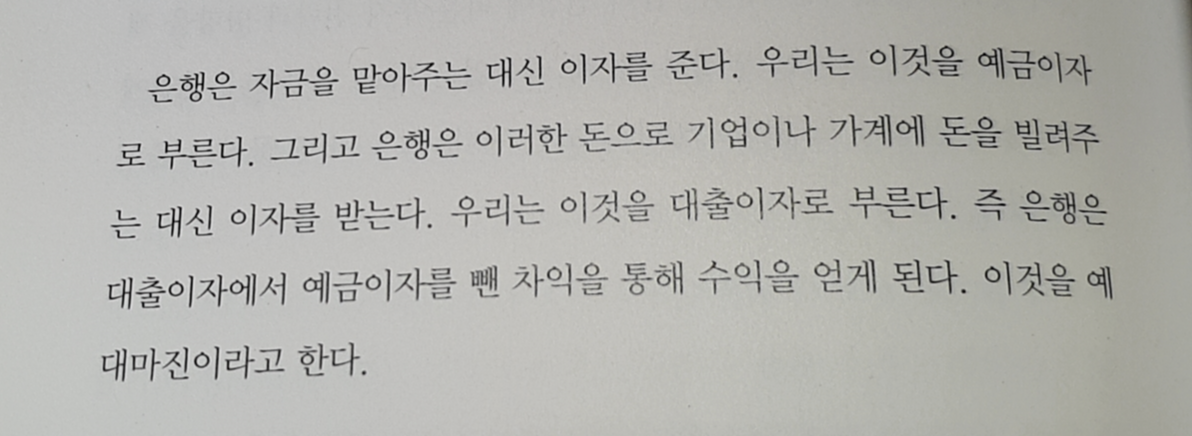 은행은 자금을 맡아주는 대신 이자를 준다. 우리는 이것을 예금이자로 부른다. 그리고 은행은 이러한 돈으로 기업이나 가계에 돈을 빌려주는 대신 이자를 받는다. 우리는 이것을 대출이자로 부른다. 즉 은행은 대출이자에서 예금이자를 뺀 차익을 통해 수익을 얻게 된다. 이것을 예대마진이라고 한다.