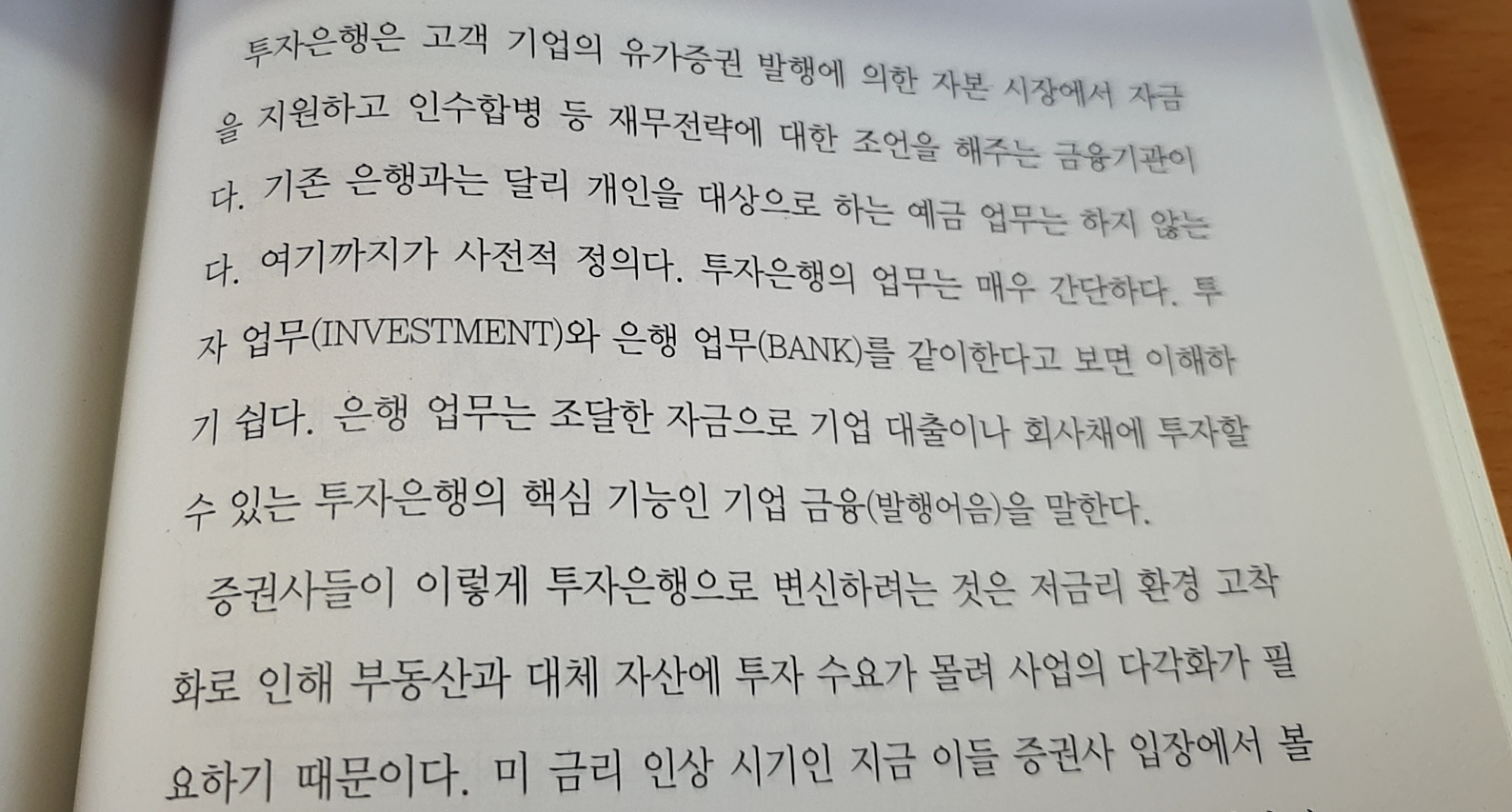 투자은행은 고객 기업의 유가증권 발행에 의한 자본 시장에서 자금을 지원하고 인수합병 등 재무전략에 대한 조언을 해주는 금융기관이다. 기존 은행과는 달리 개인을 대상으로 하는 예금 업무는 하지 않는다. 여기까지가 사전적 정의다. 투자은행의 업무는 매우 간단하다. 투자 업무(INVESTMENT)와 은행 업무(BANK)를 같이한다고 보면 이해하 기 쉽다. 은행 업무는 조달한 자금으로 기업 대출이나 회사채에 투자할 수 있는 투자은행의 핵심 기능인 기업 금융(발행어음)을 말한다.