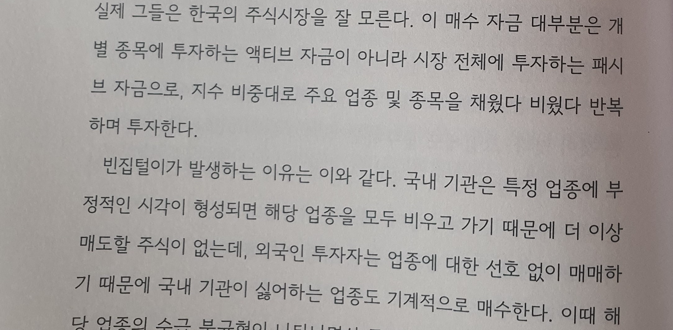 외국인들이...... 이 매수 자금 대부분은 개 별 종목에 투자하는 액티브 자금이 아니라 시장 전체에 투자하는 패시브 자금으로, 지수 비중대로 주요 업종 및 종목을 채웠다 비웠다 반복하며 투자한다.