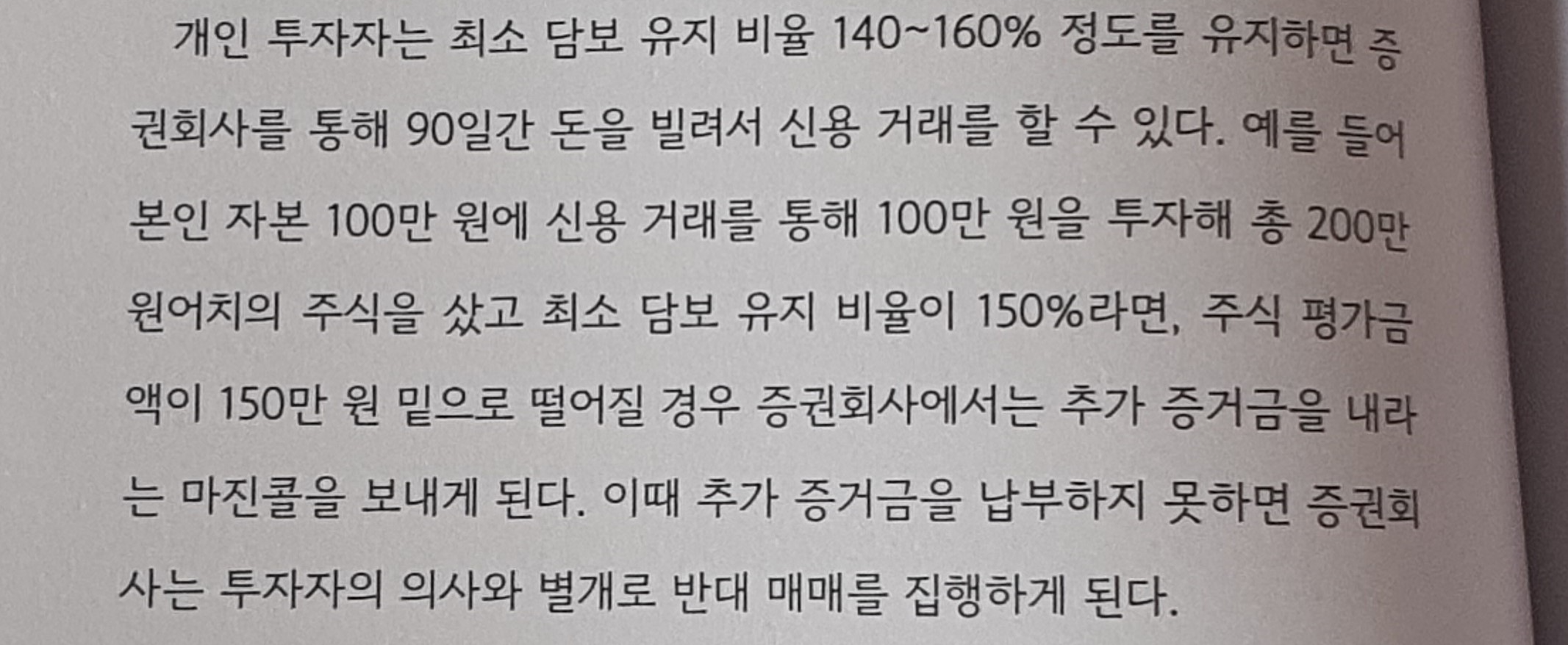 개인 투자자는 최소 담보 유지 비율 140~160% 정도를 유지하면 증권회사를 통해 90일간 돈을 빌려서 신용 거래를 할 수 있다. 예를 들어 본인 자본 100만 원에 신용 거래를 통해 100만 원을 투자해 총 200만 원어치의 주식을 샀고 최소 담보 유지 비율이 150%라면, 주식 평가금 액이 150만 원 밑으로 떨어질 경우 증권회사에서는 추가 증거금을 내라 는 마진콜을 보내게 된다. 이때 추가 증거금을 납부하지 못하면 증권회 사는 투자자의 의사와 별개로 반대 매매를 집행하게 된다.