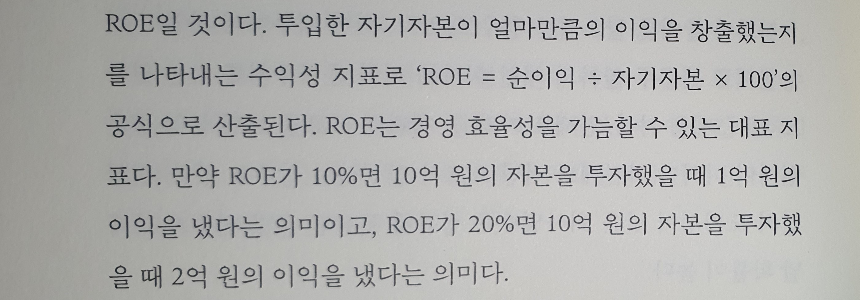 ROE란 투입한 자기 자본이 얼마만큼의 이익을 창출했는지를 나타내는 수익성 지표로 'ROE = 순이익 ÷ 자기자본 × 100'의 공식으로 산출된다. ROE는 경영 효율성을 가늠할 수 있는 대표 지표다. 만약 ROE가 10%면 10억 원의 자본을 투자했을 때 1억 원의 이익을 냈다는 의미이고, ROE가 20% 면 10억 원의 자본을 투자했 을 때 2억 원의 이익을 냈다는 의미다.