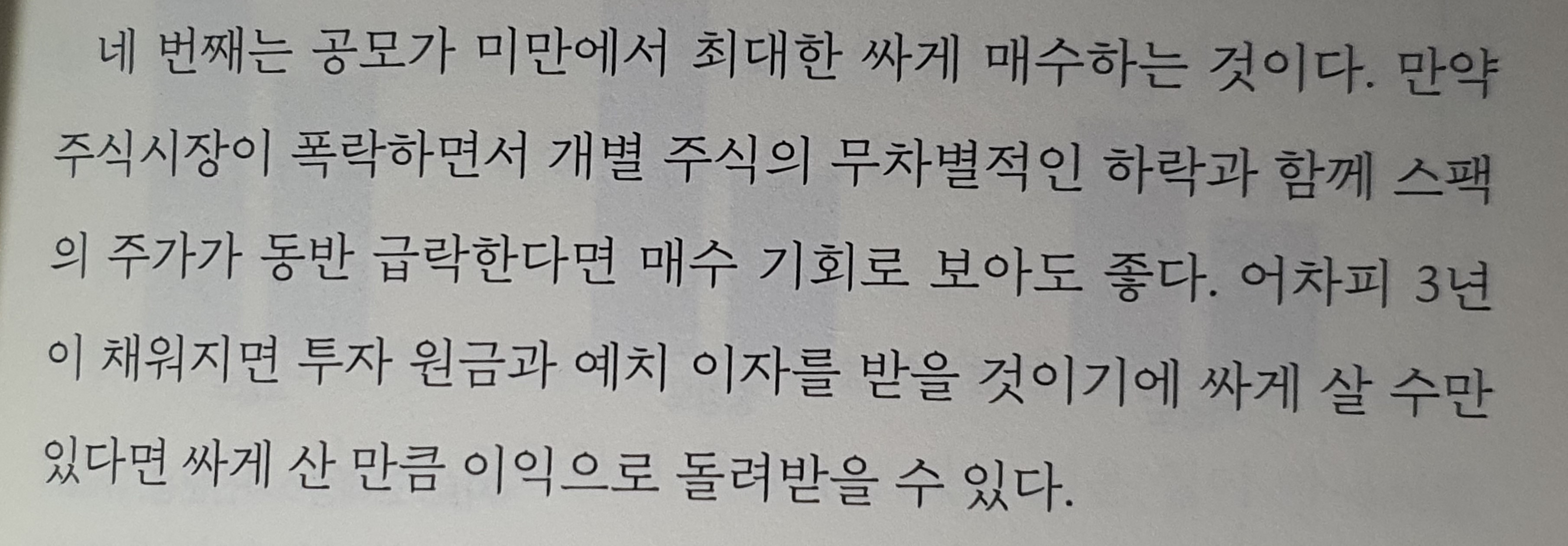 네 번째는 공모가 미만에서 최대한 싸게 매수하는 것이다. 만약 주식시장이 폭락하면서 개별 주식의 무차별적인 하락과 함께 스팩 의 주가가 동반 급락한다면 매수 기회로 보아도 좋다.