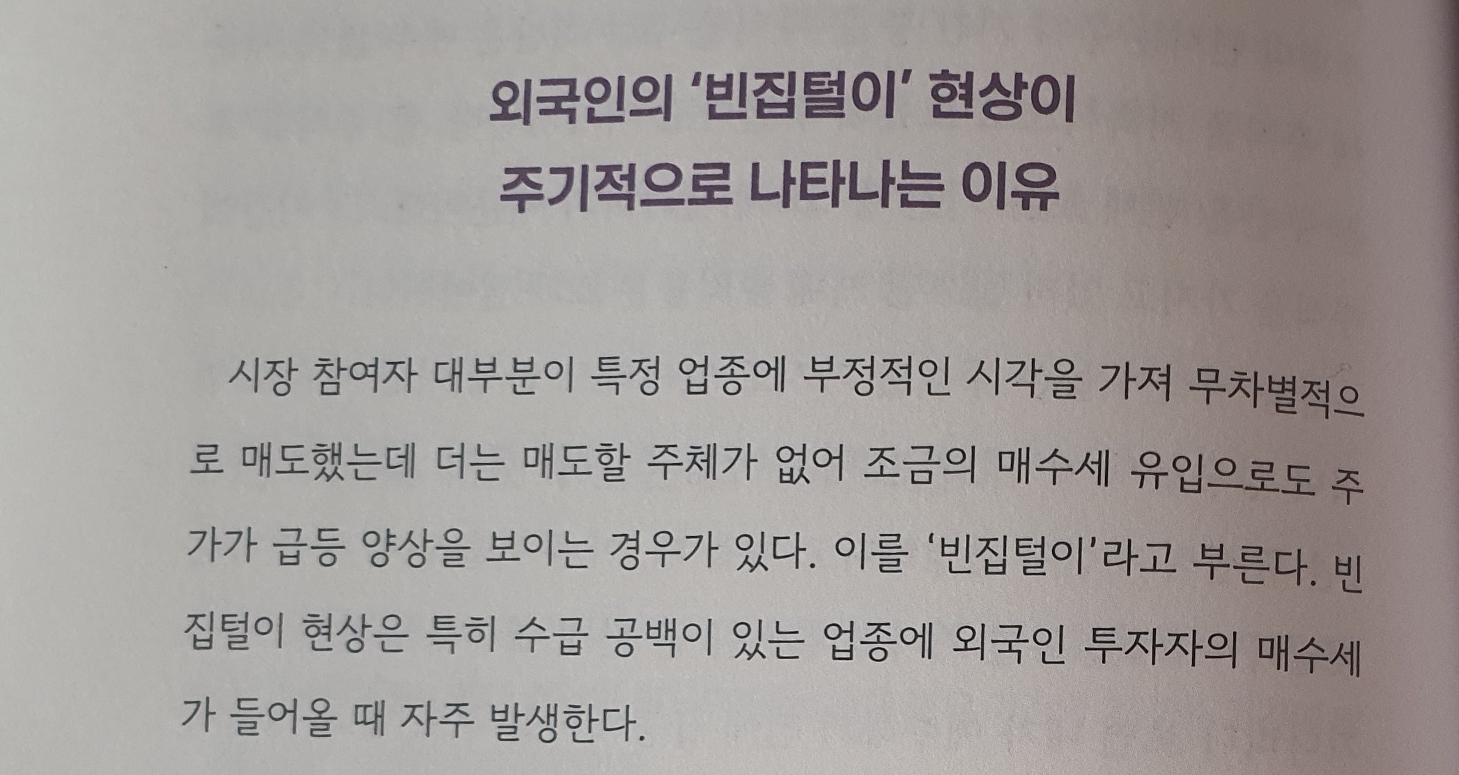 시장 참여자 대부분이 특정 업종에 부정적인 시각을 가져 무차별적으로 매도했는데 더는 매도할 주체가 없어 조금의 매수세 유입으로도 주가가 급등 양상을 보이는 경우가 있다. 이를 '빈집털이'라고 부른다. 빈집털이 현상은 특히 수급 공백이 있는 업종에 외국인 투자자의 매수세 가 들어올 때 자주 발생한다.