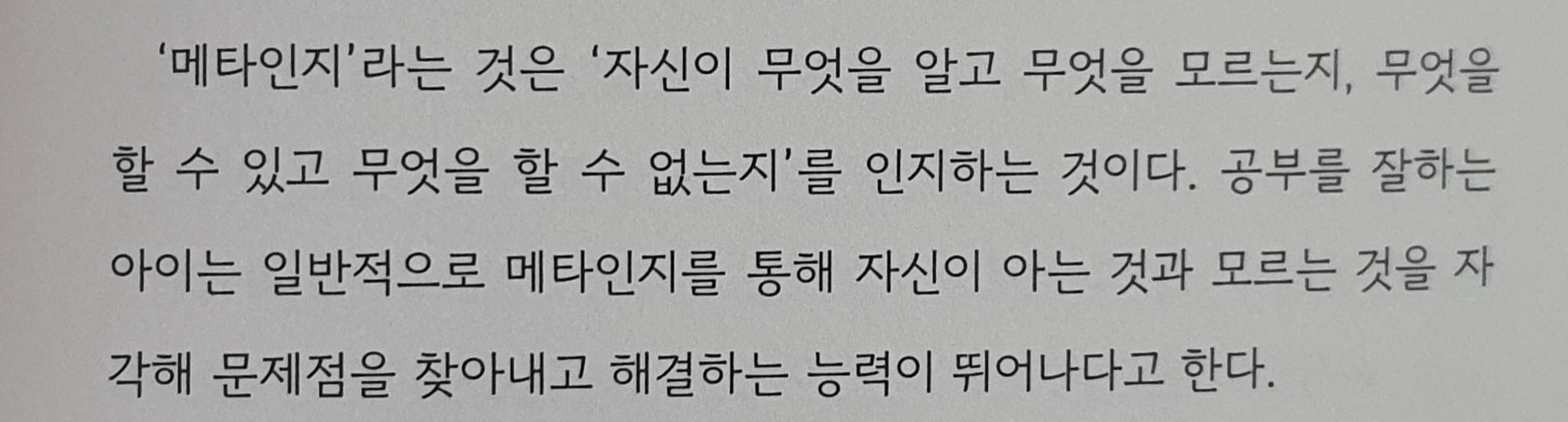 '메타인지'라는 것은 '자신이 무엇을 알고 무엇을 모르는지, 무엇을 할 수 있고 무엇을 할 수 없는지'를 인지하는 것이다. 공부를 잘하는 아이는 일반적으로 메타인지를 통해 자신이 아는 것과 모르는 것을 자 각해 문제점을 찾아내고 해결하는 능력이 뛰어나다고 한다.