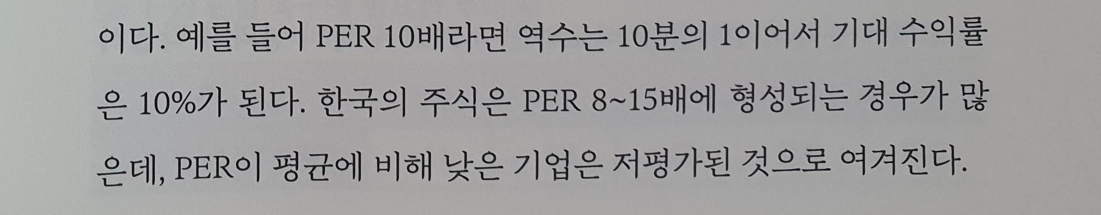 예를 들어 PER 10배라면 역수는 10분의 1이어서 기대 수익률 은 10%가 된다. 한국의 주식은 PER 8~15배에 형성되는 경우가 많은데, PER이 평균에 비해 낮은 기업은 저평가된 것으로 여겨진다.