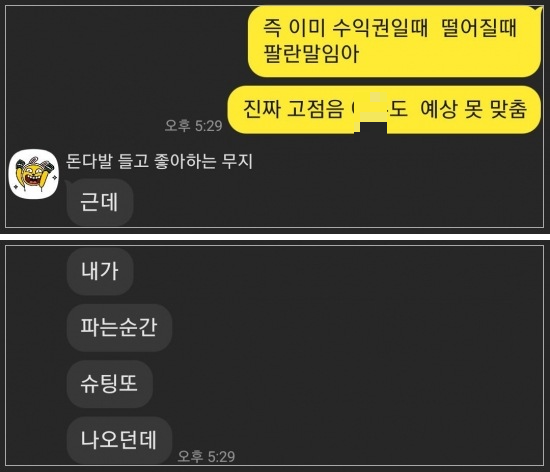 위 채팅에서 지인은 '자신이 매도를 하면, 그 주식이 슈팅나올까봐 못한다'라고 말합니다.