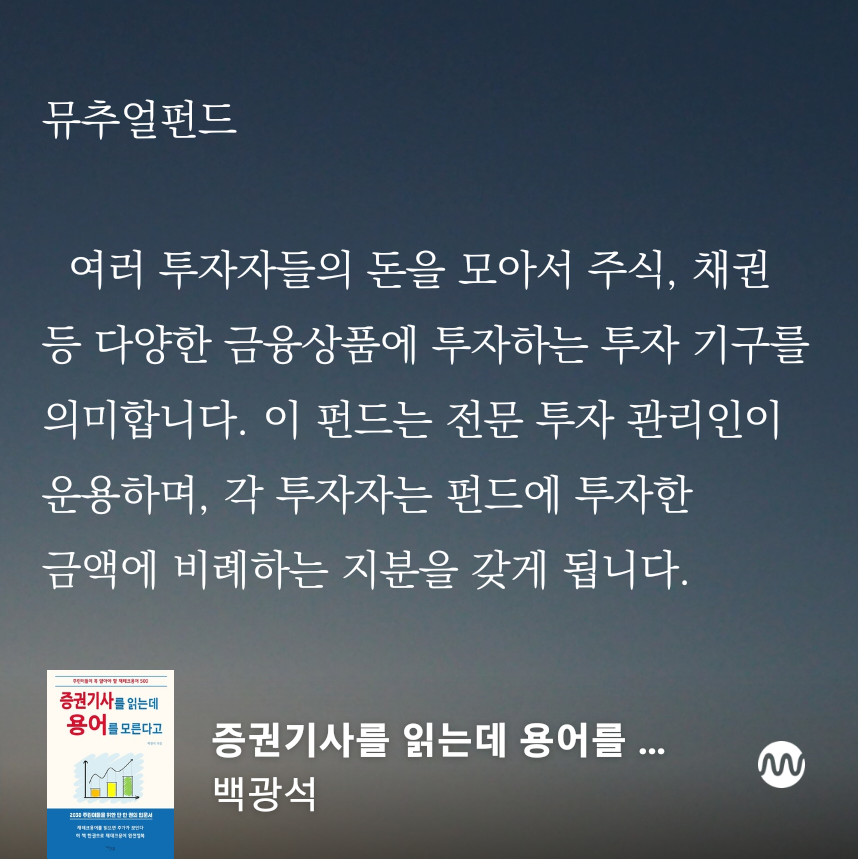 뮤추얼펀드 : 여러 투자자들의 돈을 모아서 주식, 채권 등 다양한 금융상푸에 투자하는 투자기구를 의미합니다. 이 펀드는 전문 투자관리인이 운용하며, 각 투자자는 펀드에 투자한 금액에 비례하는 지분을 갖게 됩니다.
