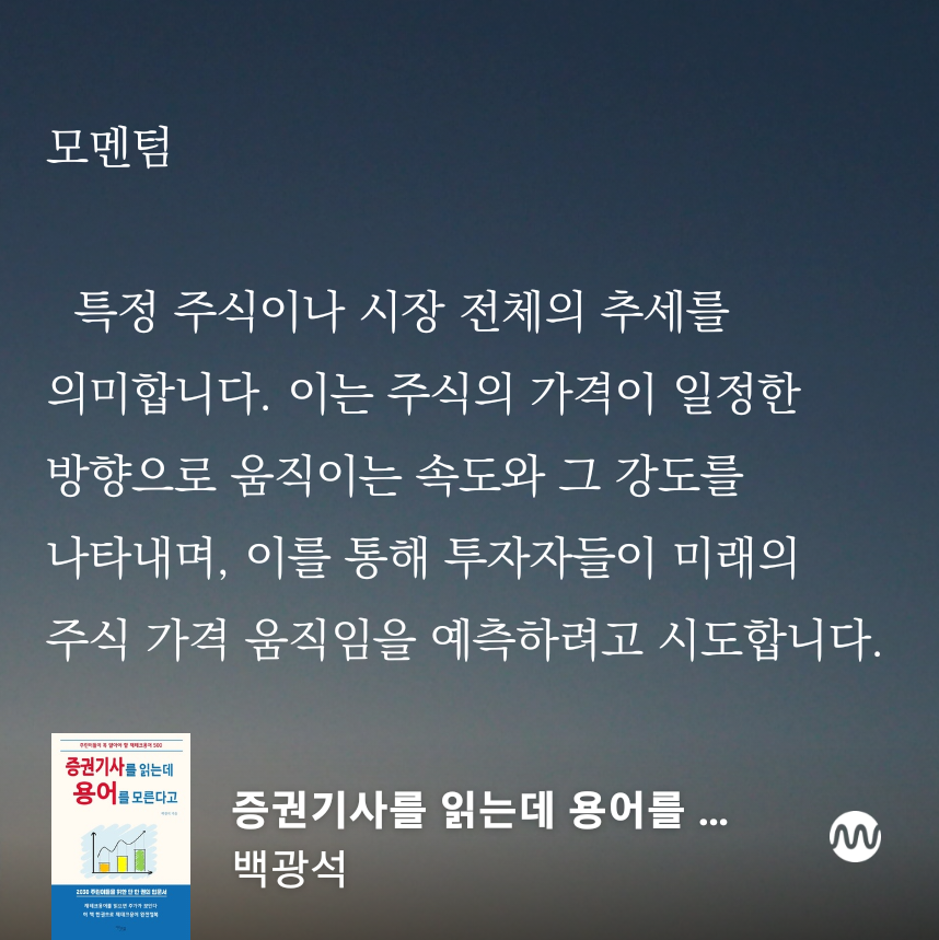 모멘텀 : 특정 주식이나 시장 전체의 추세를 의미합니다. 이는 주식의 가격이 일정한 방향으로 움직이는 속도와 그 강도를 나타내며, 이를 통해 투자자들이 미래의 주식 가격 움직임을 예측하려고 시도합니다.