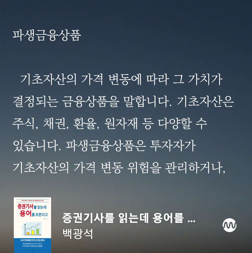 파생금융상품 : 기초자산의 가격 변동에 따라 그 가치가 결정되는 금융상품을 말합니다. 기초자산은 주식, 채권, 환율, 원자재 등 다양할 수 있습니다.