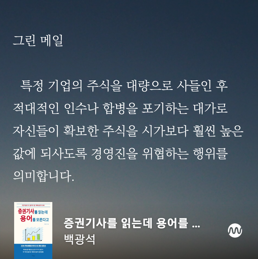 그린메일 : 특정기업의 주식을 대량으로 사들인 후 적대적인 인수나 합병을 포기하는 대가로 자신들이 확보한 주식을 시가보다 훨씬 높은 값에 되사도록 경영진을 위협하는 행위를 의미합니다.