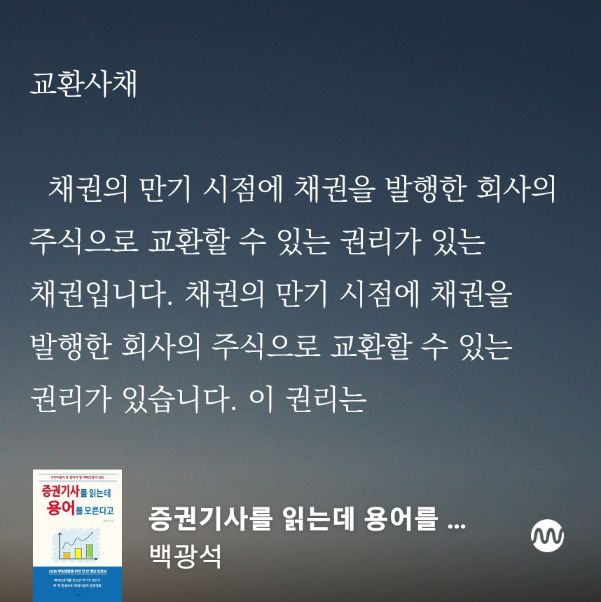 교환사채 : 채권의 만기 시점에 채권을 발행한 회사의 주식으로 교환할 수 있는 권리가 있는 채권입니다. 채권의 만기 시점에 채권을 발행한 회사의 주식으로 교환할 수 있는 권리가 있습니다.