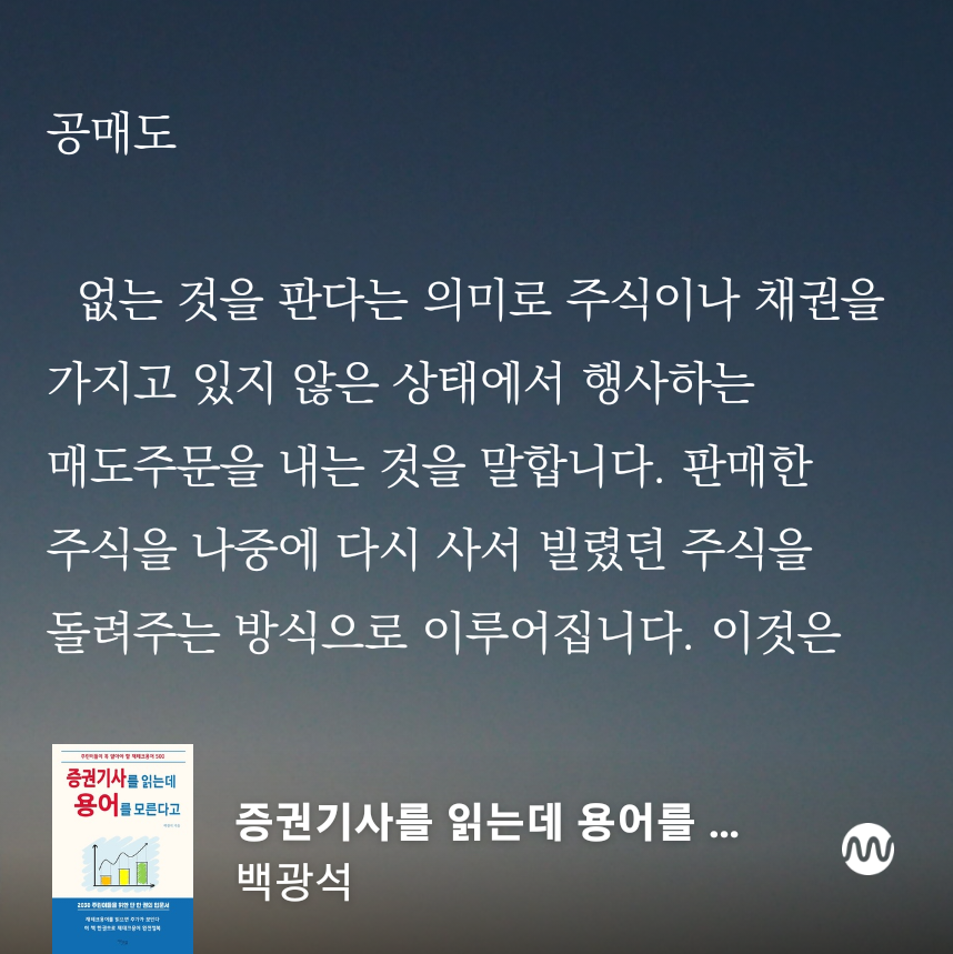 공매도 : 없는 것을 판다는 의미로 주식이나 채권을 가지고 있지 않은 상태에서 행사하는 매도주문을 내는 것을 말합니다. 판매한 주식을 나중에 다시 사서 빌렸던 주식을 돌려주는 방식으로 이루어집니다.