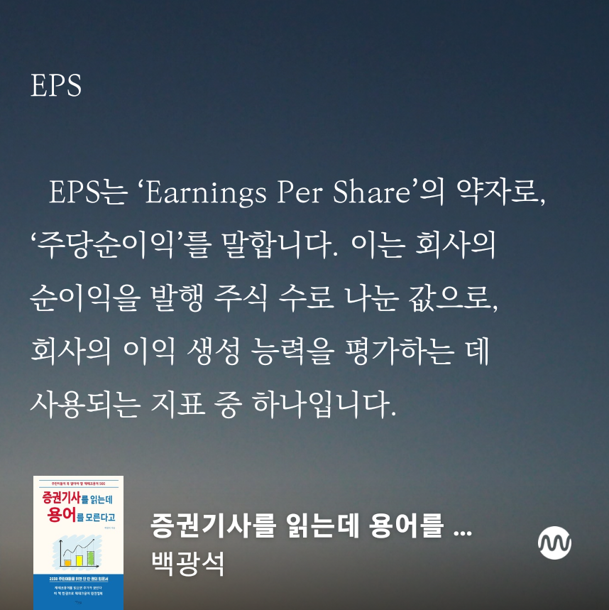 EPS : EPS는 'Earnings Per Share'의 약자로 '주당순이익'을 말합니다. 이는 회사의 순이익을 발행 주식 수로 나눈 값으로, 회사의 이익 생성 능력을 평가하는 데 사용되는 지표 중 하나입니다.
