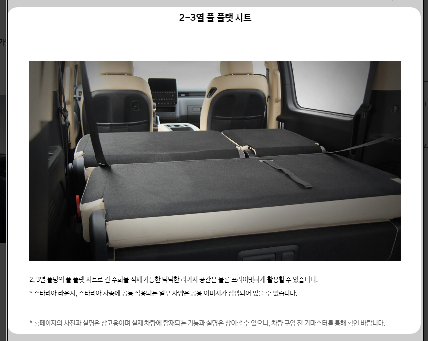 스타리아 기본 옵션으로 2열, 3열 좌석을 풀 플랫이 가능하다고 합니다.