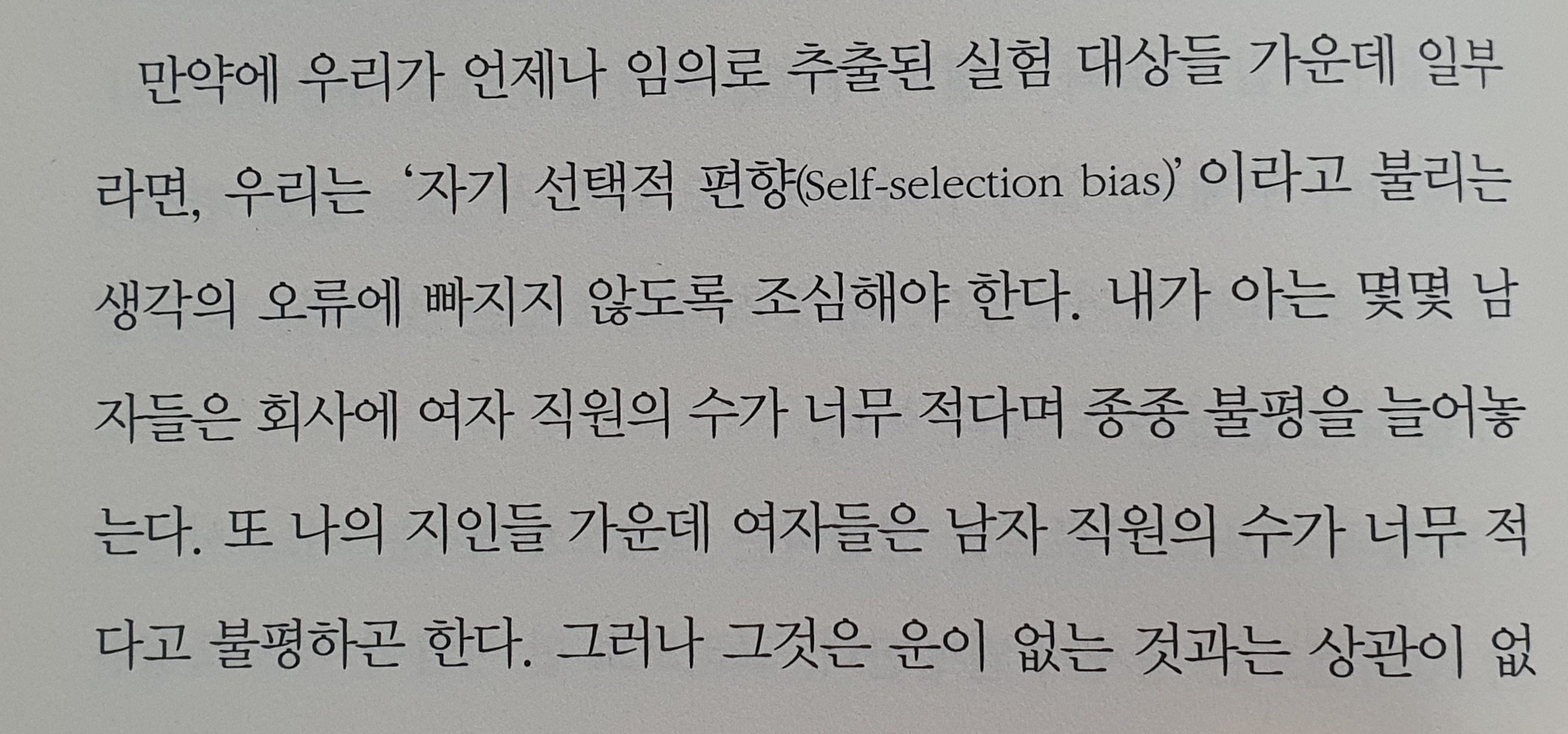 내가 아는 몇몇 남자들은 회사에 여자 직원의 수가 너무 적다며 종종 불평을 늘어놓 는다. 또 나의 지인들 가운데 여자들은 남자 직원의 수가 너무 적 다고 불평하곤 한다. 그러나 그것은 운이 없는 것과는 상관이 없다....... 임의의 한 남자가 남자 직원이 더 많은 어느 업종에서 일할 확률은 높다. 여자들의 경우도 마찬가지다.