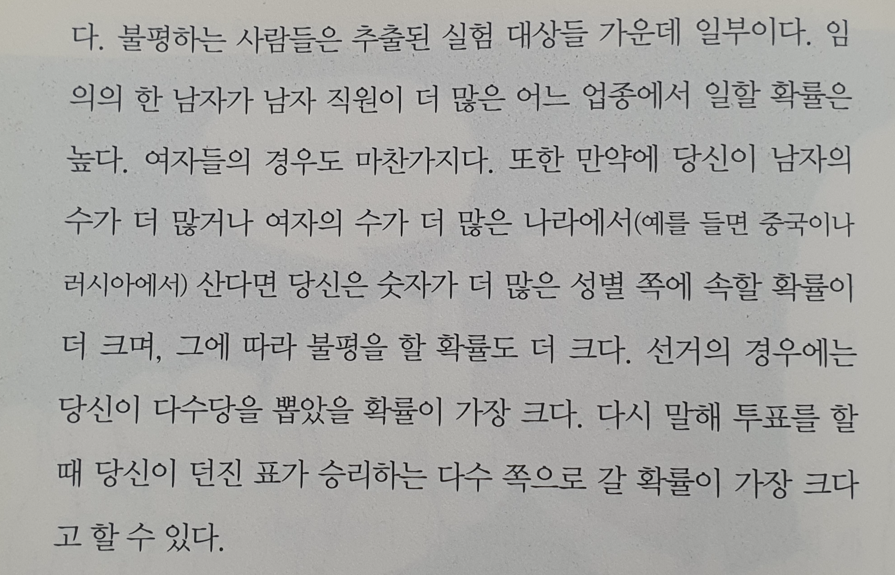 선거의 경우에는 당신이 다수당을 뽑았을 확률이 가장 크다. 다시 말해 투표를 할 때 당신이 던진 표가 승리하는 다수 쪽으로 갈 확률이 가장 크다 고 할 수 있다.