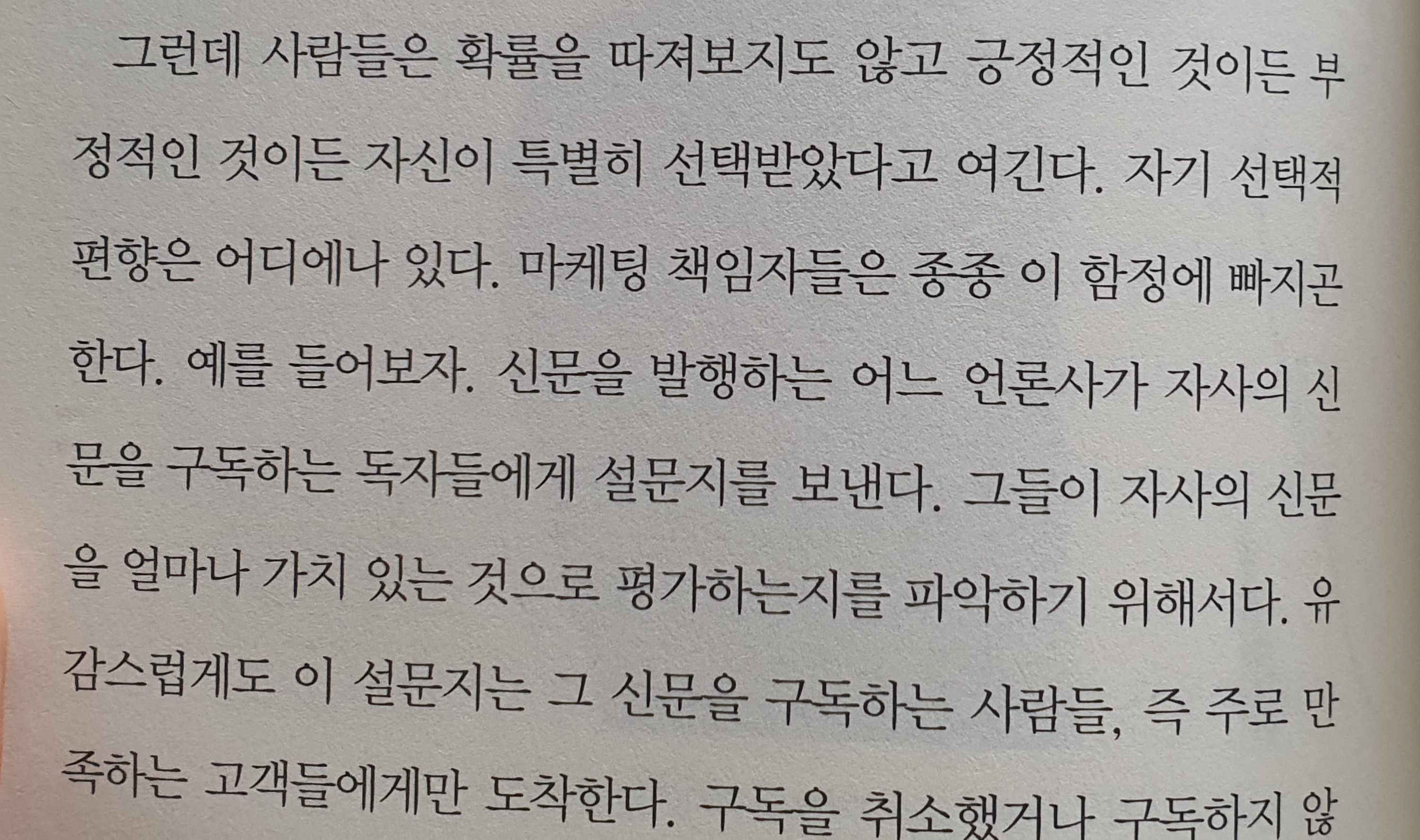 마케팅 책임자들은 종종 이 함정에 빠지곤 한다. 예를 들어보자. 신문을 발행하는 어느 언론사가 자사의 신문을 구독하는 독자들에게 설문지를 보낸다. 그들이 자사의 신문을 얼마나 가치 있는 것으로 평가하는지를 파악하기 위해서다. 유감스럽게도 이 설문지는 그 신문을 구독하는 사람들, 즉 주로 만족하는 고객들에게만 도착한다.