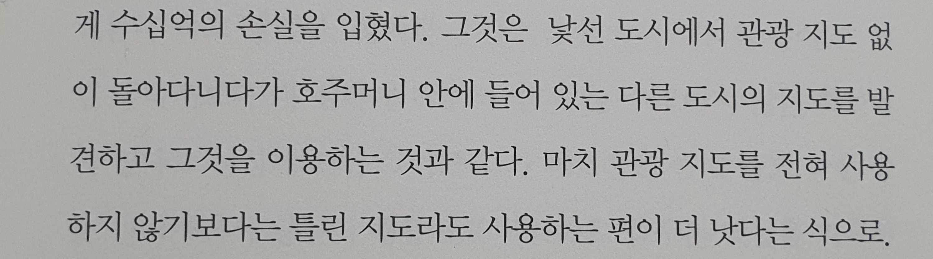 그것은 낯선 도시에서 관광 지도 없이 돌아다니다가 호주머니 안에 들어 있는 다른 도시의 지도를 발견하고 그것을 이용하는 것과 같다. 마치 관광 지도를 전혀 사용하지 않기보다는 틀린 지도라도 사용하는 편이 더 낫다는 식으로.