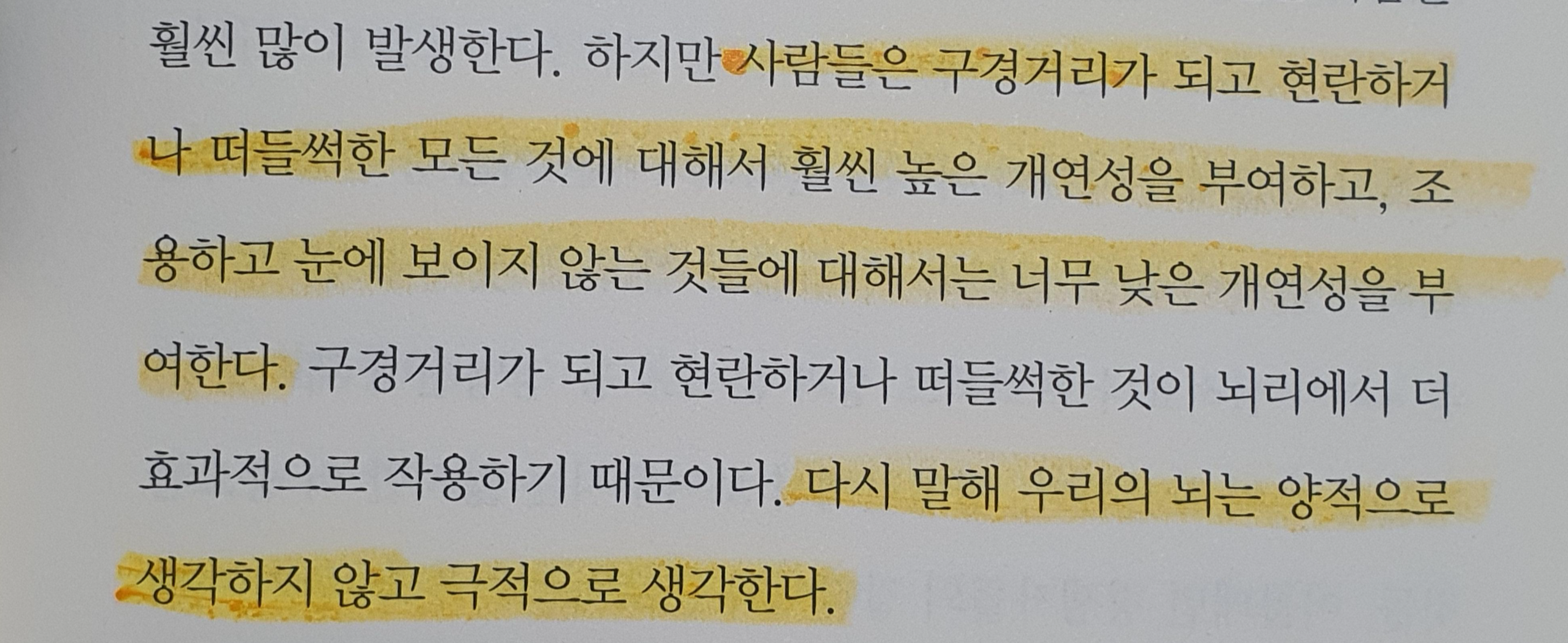 사람들은 구경거리가 되고 현란하거나 떠들썩한 모든 것에 대해서 훨씬 높은 개연성을 부여하고, 조용하고 눈에 보이지 않는 것들에 대해서는 너무 낮은 개연성을 부여한다. 구경거리가 되고 현란하거나 떠들썩한 것이 뇌리에서 더 효과적으로 작용하기 때문이다. 다시 말해 우리의 뇌는 양적으로 생각하지 않고 극적으로 생각한다.