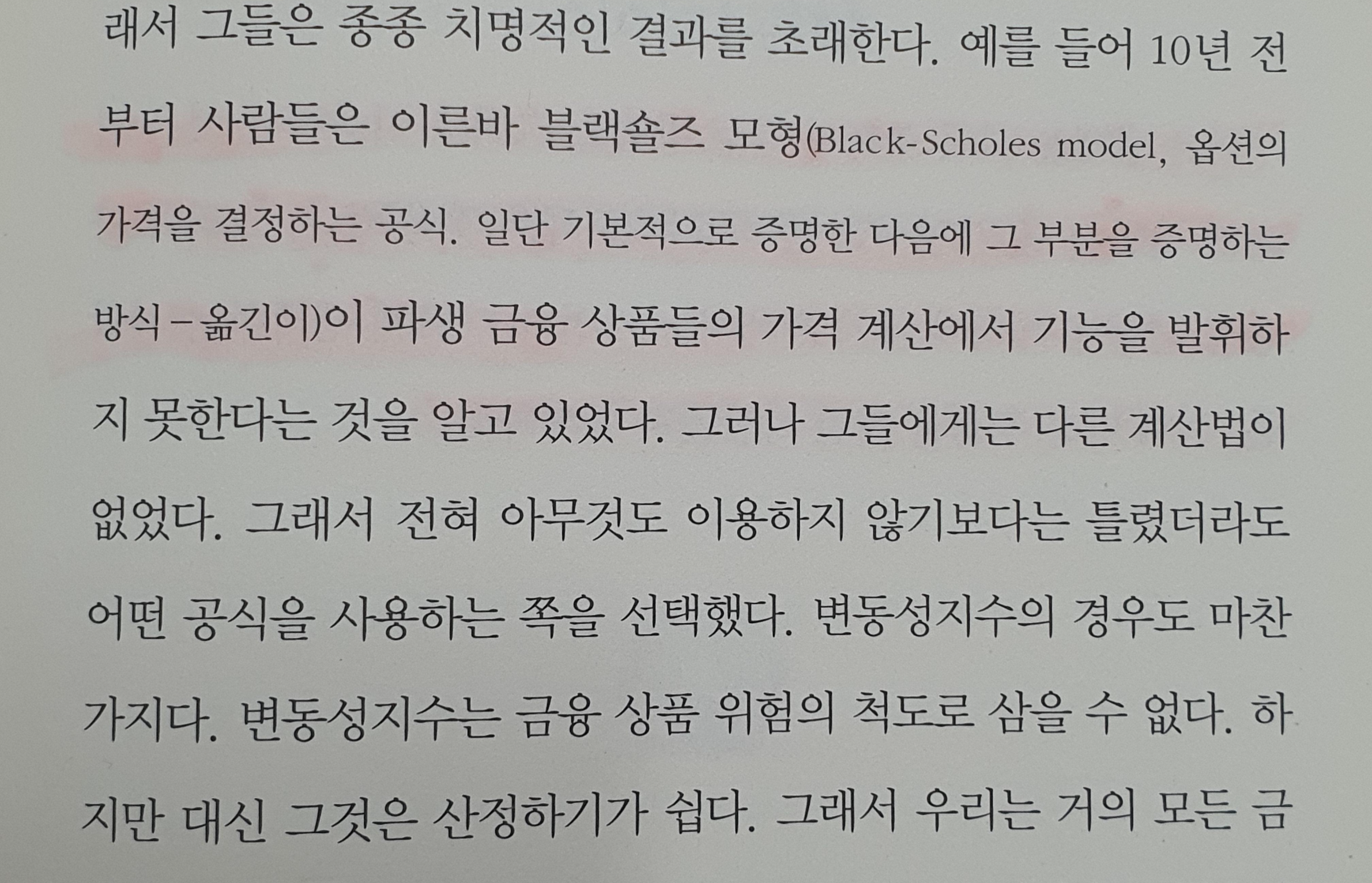 예를 들어 10년 전 부터 사람들은 이른바 블랙숄즈 모형(Black-Scholes model, 옵션의 가격을 결정하는 공식. 일단 기본적으로 증명한 다음에 그 부분을 증명하는 방식 - 옮긴이)이 파생 금융 상품들의 가격 계산에서 기능을 발휘하 지 못한다는 것을 알고 있었다. 그러나 그들에게는 다른 계산법이 없었다. 그래서 전혀 아무것도 이용하지 않기보다는 틀렸더라도 어떤 공식을 사용하는 쪽을 선택했다. 변동성지수의 경우도 마찬 가지다. 변동성지수는 금융 상품 위험의 척도로 삼을 수 없다.