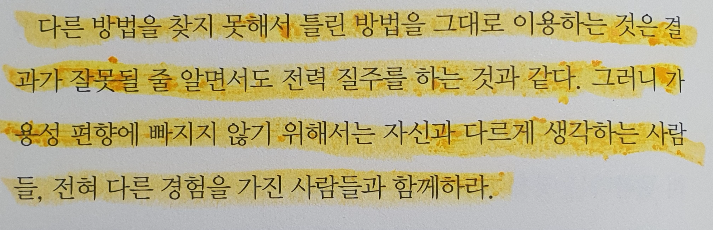 다른 방법을 찾지 못해서 틀린 방법을 그대로 이용하는 것은 결과가 잘못될 줄 알면서도 전력 질주를 하는 것과 같다. 그러니 가용성 편향에 빠지지 않기 위해서는 자신과 다르게 생각하는 사람들, 전혀 다른 경험을 가진 사람들과 함께하라.
