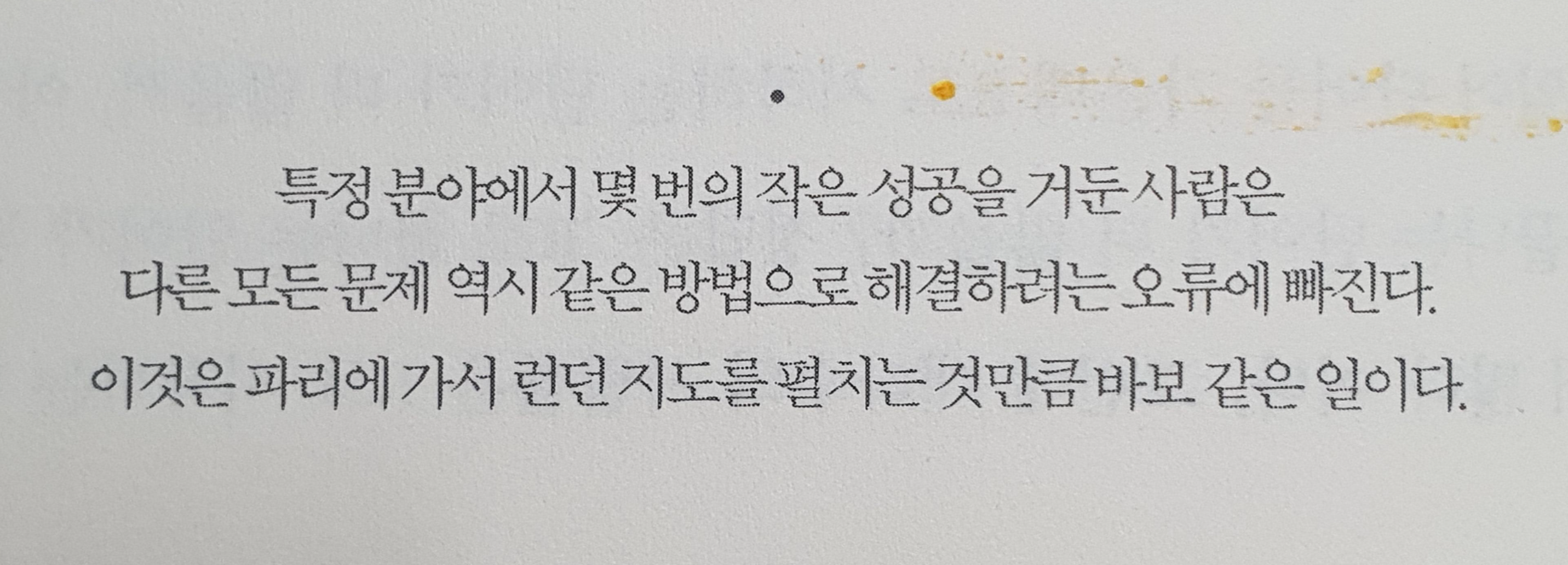 특정 분야에서 몇 번의 작은 성공을 거 둔사람은 다른 모든 문제 역시 같은 방법으로 해결하려는 오류에 빠진다. 이것은 파리에 가서 런던 지도를 펼치는 것만큼 바보 같은 일이다.