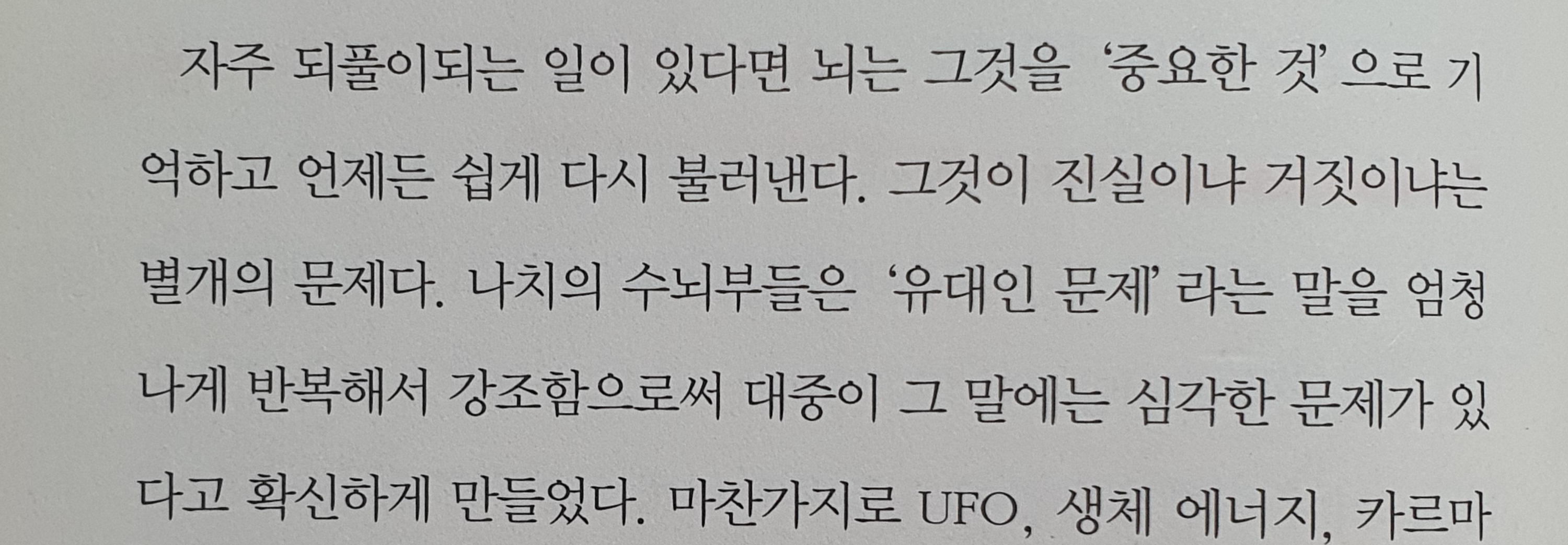 자주 되풀이되는 일이 있다면 뇌는 그것을 '중요한 것'으로 기억하고 언제든 쉽게 다시 불러낸다. 그것이 진실이냐 거짓이냐는 별개의 문제다. 나치의 수뇌부들은 '유대인 문제'라는 말을 엄청나게 반복해서 강조함으로써 대중이 그 말에는 심각한 문제가 있다고 확신하게 만들었다.
