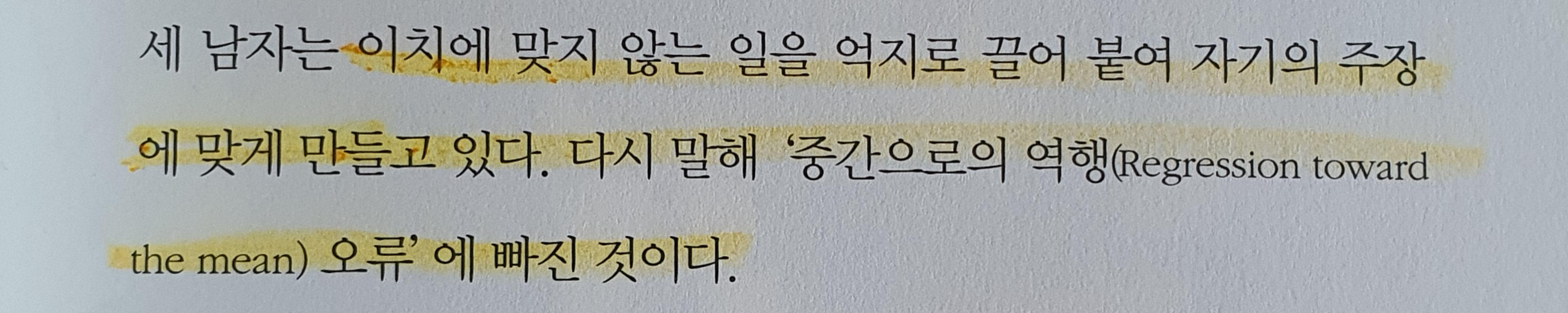 이치에 맞지 않는 일을 억지로 끌어 붙여 자기의 주장에 맞게 만들고 있다. 다시 말해 '중간으로의 역행(Regression toward the mean) 오류'에 빠진 것이다.