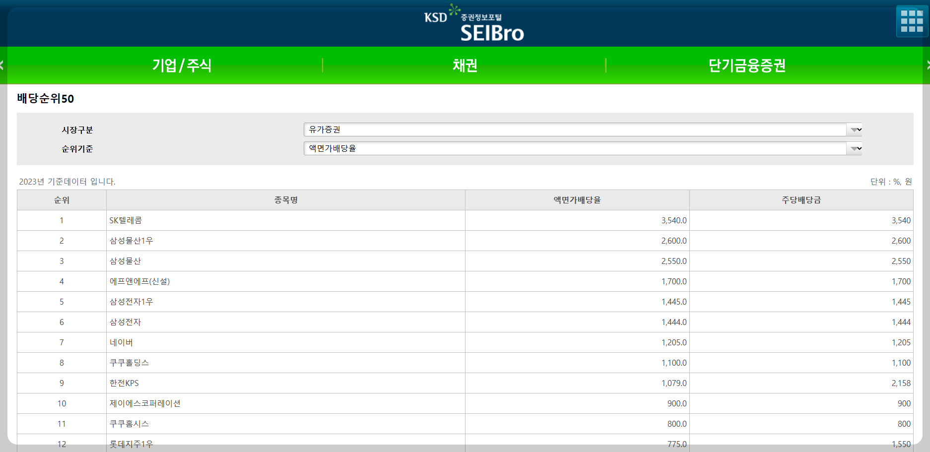 위 사이트 : https://m.seibro.or.kr/cnts/company/selectDiv50.do