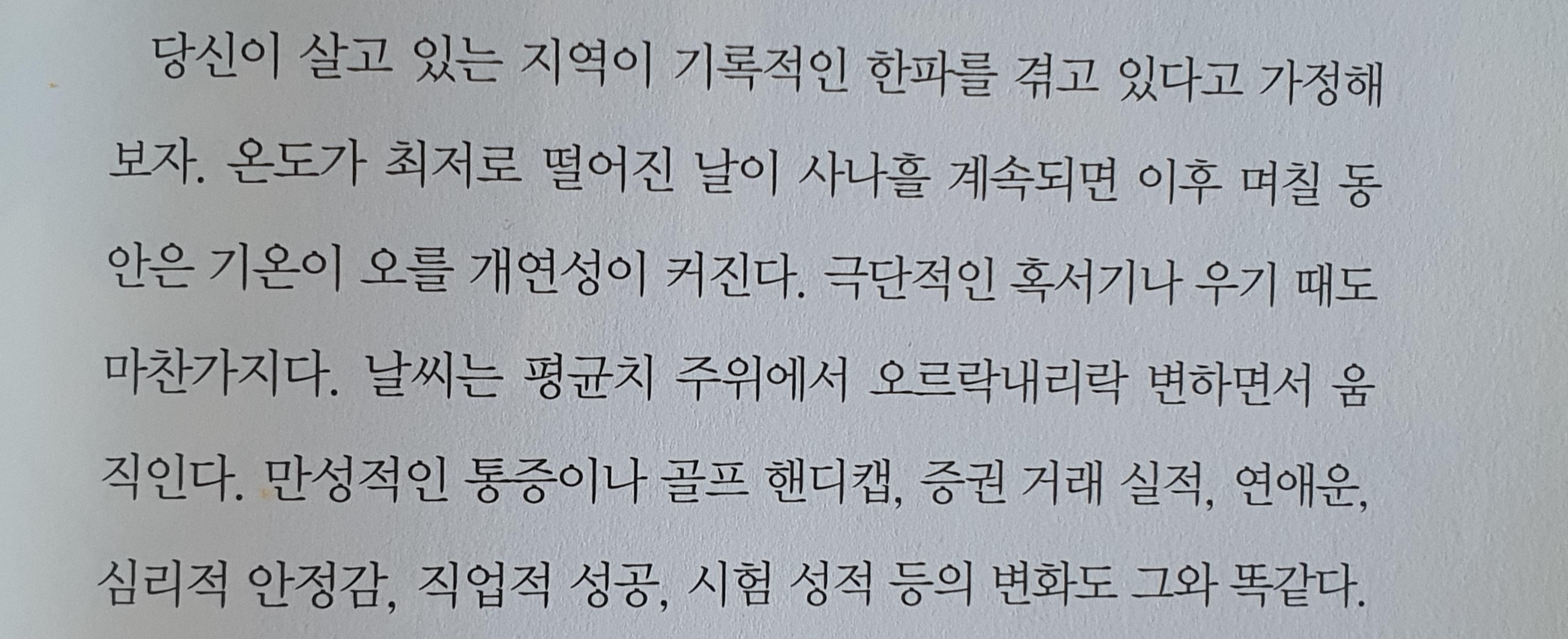 당신이 살고 있는 지역이 기록적인 한파를 겪고 있다고 가정해 보자. 온도가 최저로 떨어진 날이 사나흘 계속되면 이후 며칠 동 안은 기온이 오를 개연성이 커진다. 극단적인 혹서기나 우기 때도 마찬가지다. 날씨는 평균치 주위에서 오르락내리락 변하면서 움 직인다. 만성적인 통증이나 골프 핸디캡, 증권 거래 실적, 연애운, 심리적 안정감, 직업적 성공, 시험 성적 등의 변화도 그와 똑같다.