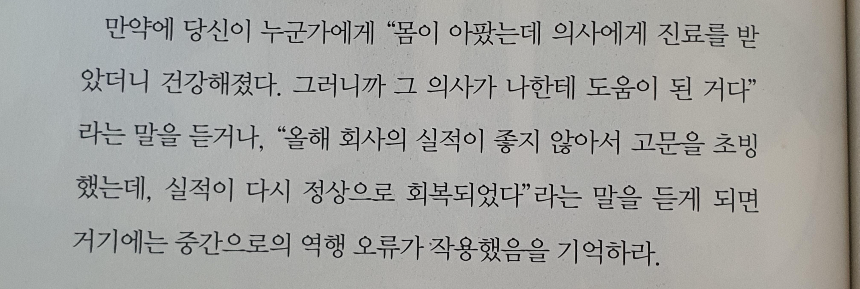 만약에 당신이 누군가에게 “몸이 아팠는데 의사에게 진료를 받 았더니 건강해졌다. 그러니까 그 의사가 나한테 도움이 된 거다"라는 말을 듣거나, "올해 회사의 실적이 좋지 않아서 고문을 초빙했는데, 실적이 다시 정상으로 회복되었다"라는 말을 듣게 되면 거기에는 중간으로의 역행 오류가 작용했음을 기억하라.