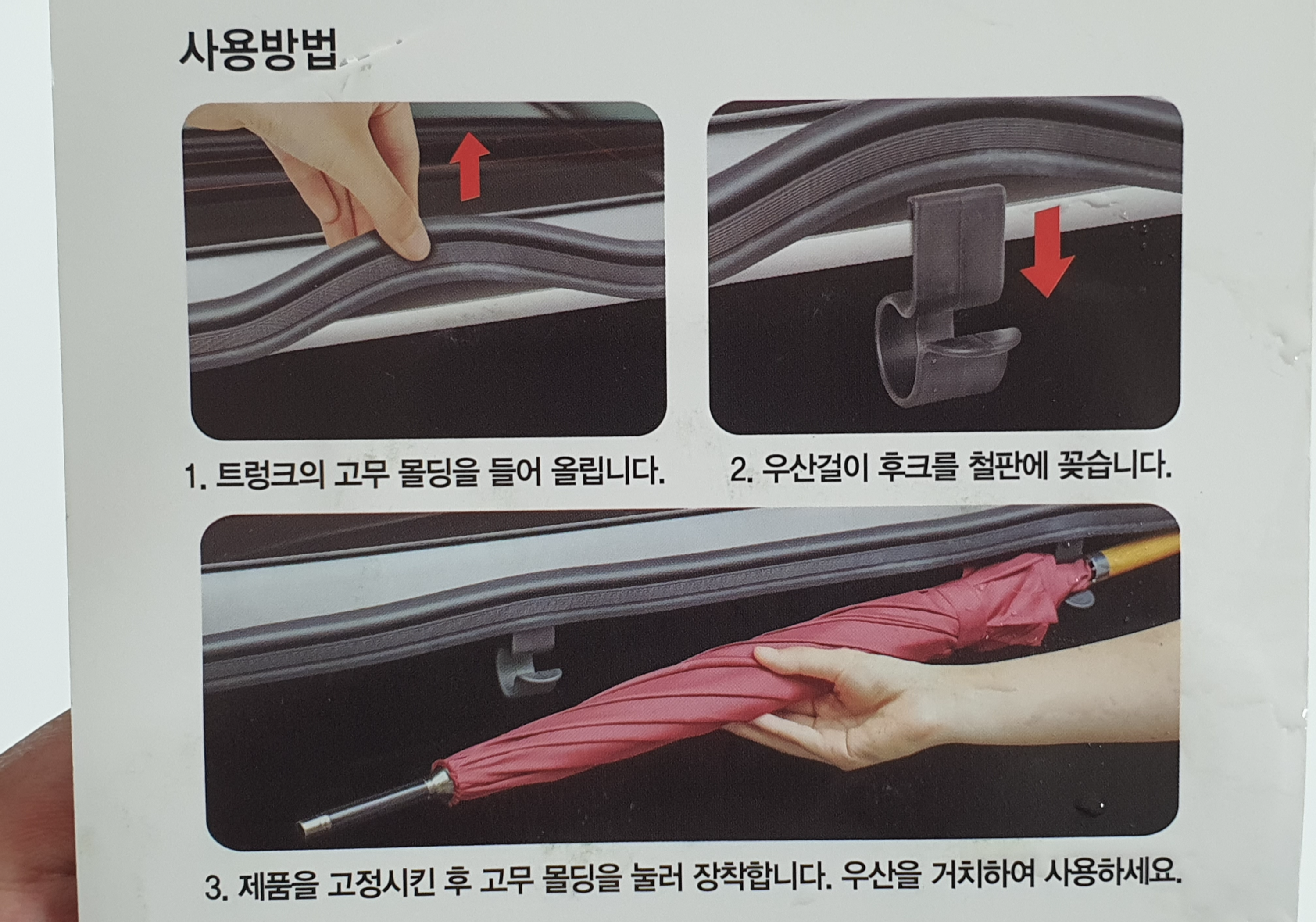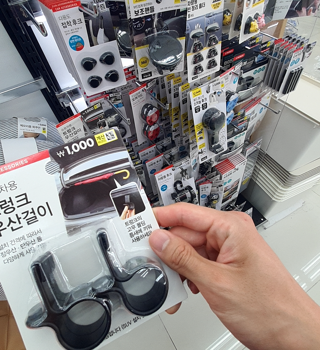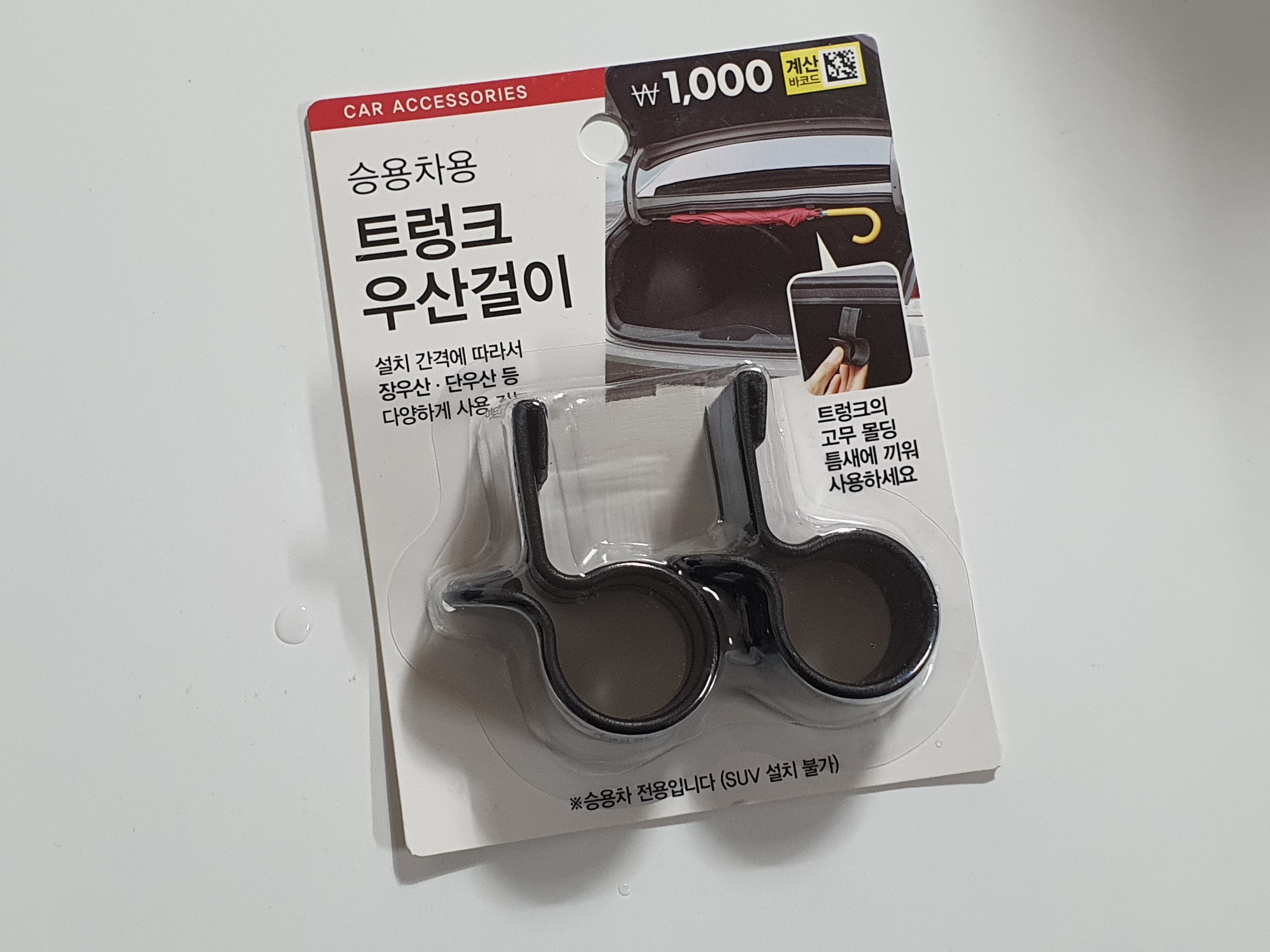위 사진은 다이소에서 구매한 '승용차용 트렁크 우산걸이' (1000원) 모습입니다.