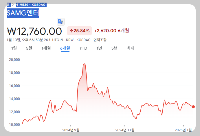그때에 이미 많이 오른 오징어게임 관련 종목을 매수하기는 무서워서 , 대신 SAMG엔터를 매수했어요.